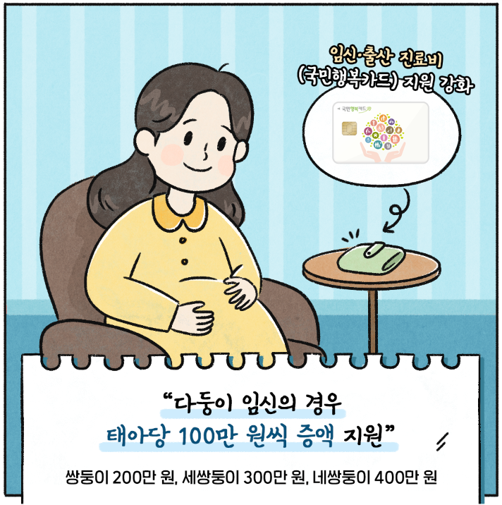 임신 중인 다둥이 엄마들에게는 태아당 100만 원씩 증액된 지원금이 제공됩니다. 쌍둥이를 가진 경우에는 200만 원, 세쌍둥이는 300만 원, 네쌍둥이는 400만 원의 지원금을 받을 수 있습니다. 또한, 임신과 출산 과정에서 발생하는 진료비에 대한 국민행복카드를 통한 지원도 강화되어 다둥이 엄마들의 경제적 부담을 덜어줍니다.