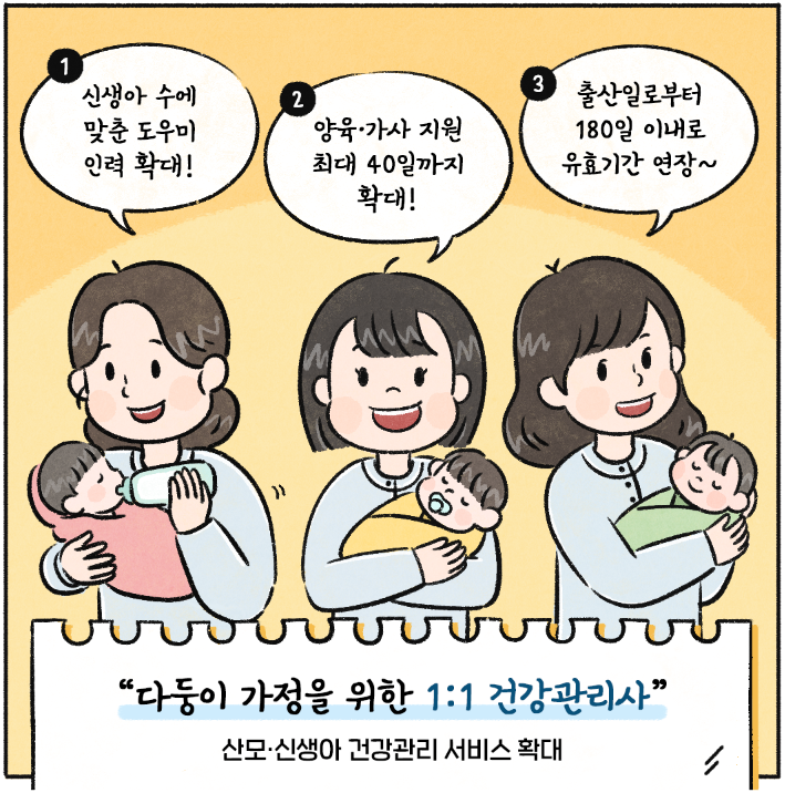 다둥이 엄마들을 위한 정책 중 하나는 1:1 건강 관리사를 통한 산모와 신생아 건강관리 서비스의 확대입니다. 다자녀를 돌봄하면서 건강 상태를 지켜야 하는 부모님들을 위해 신생아 수에 맞춘 도우미 인력이 확대되고, 양육과 가사 지원도 최대 40일까지 확대됩니다. 또한, 출산일로부터 180일 이내로 유효기간이 연장되어 더 많은 도움을 받을 수 있게 됩니다.