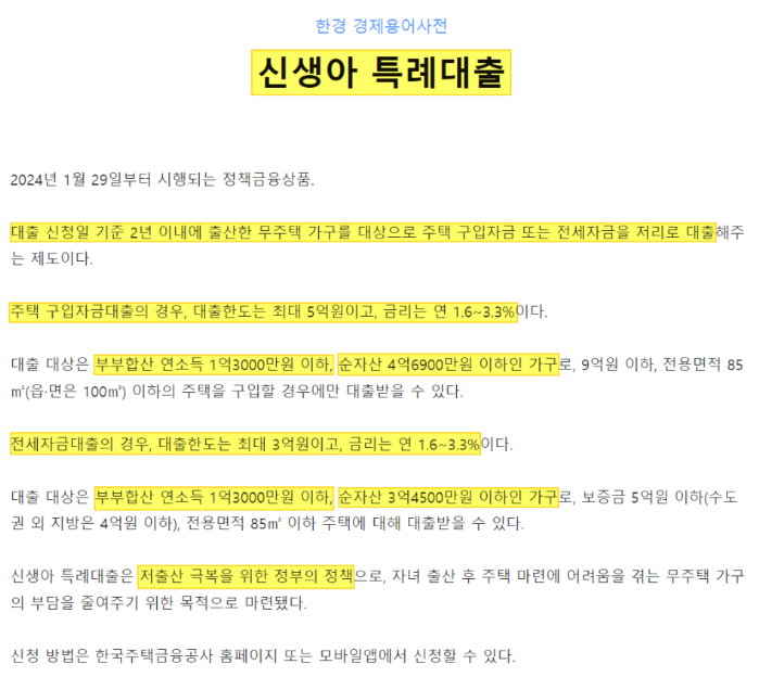 2024년부터 시작되는 신생아 특례대출은 출산 가정의 주택 마련을 지원하기 위한 정부 정책입니다. 이 대출은 출산 가정에게 저렴한 이자율로 최대 5억원까지 주택 구입자금 또는 전세자금을 제공합니다. 주요 목적은 출산을 장려하고, 젊은 가정의 주택 마련 부담을 덜어주기 위함입니다.