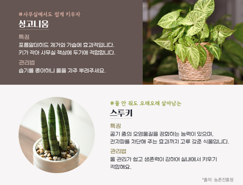 - 관리법: 물을 많이 필요로 하지 않으며 생존력이 강해 실내에서 키우기 쉽습니다.