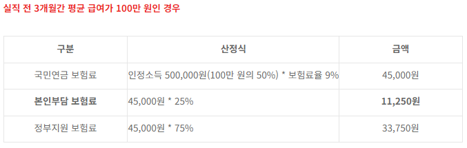 - 예시 1: 실직 전 평균 급여 100만 원 시, 인정소득 50만 원 기준으로 국민연금 보험료 산정