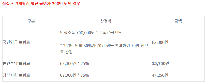 - 예시 2: 실직 전 평균 급여 200만 원 시, 인정소득 최대 70만 원을 기준으로 국민연금 보험료 산정