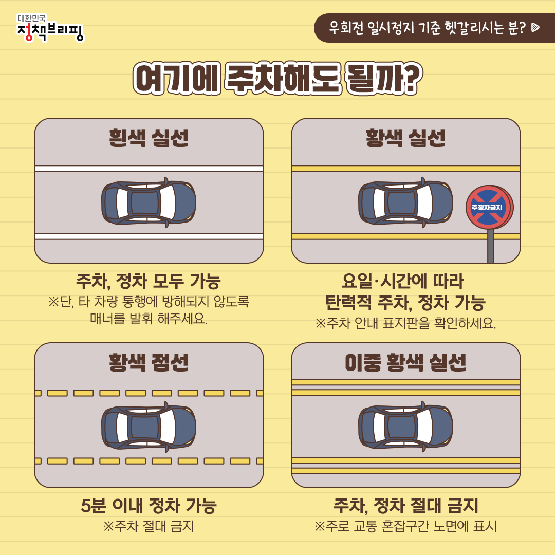 - 황색 점선: 5분 이내 정차는 가능하지만, 주차는 금지됩니다.