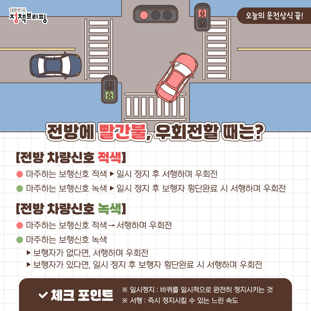 - 보행 신호가 적색이면, 서행하며 우회전 가능합니다.